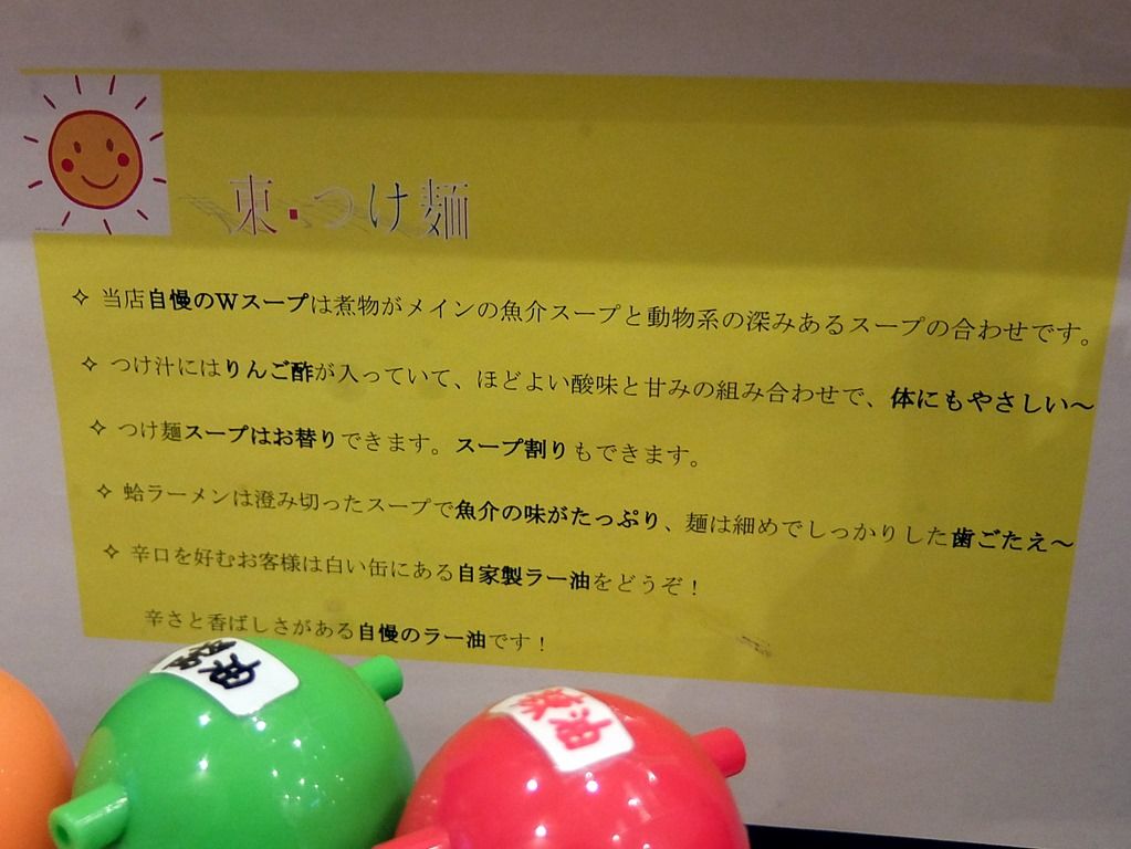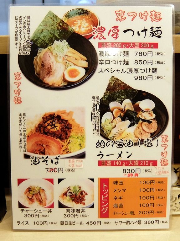 主なメニューは、濃厚つけ麺780円、はまぐりの醤油・塩ラーメン830円、油そば500円、他。 つけ麺は並盛200g・大盛300g、ラーメンは並盛140g、大盛210g同料金。