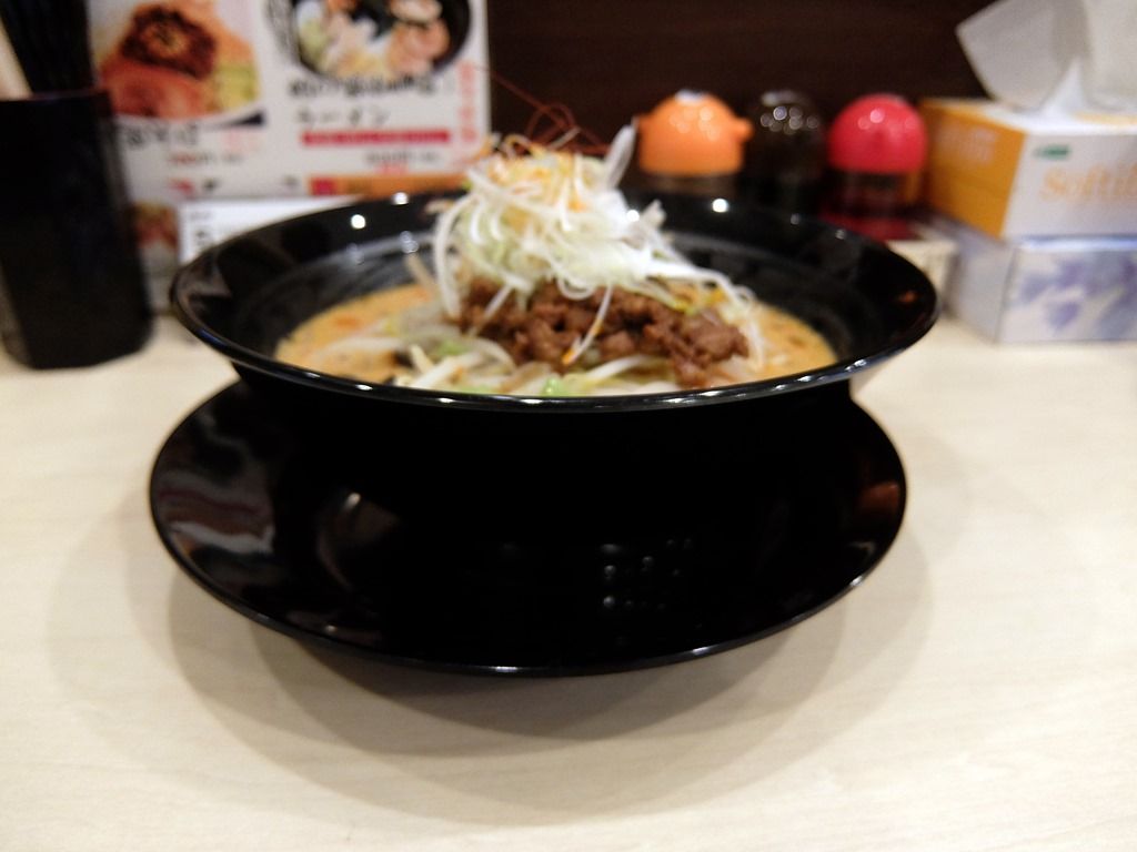 黒い受皿付きの黒い丼で登場。 具は、糸唐辛子、白髪ネギ、肉味噌というか肉そぼろ、もやし、キャベツ、きくらげ、他。