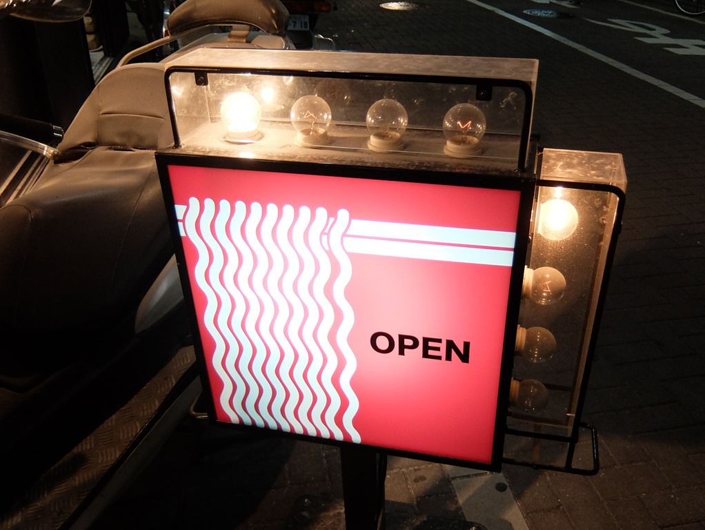 店頭の派手な電飾看板、デザインは麺と箸。
