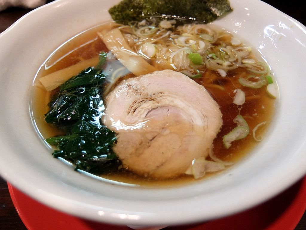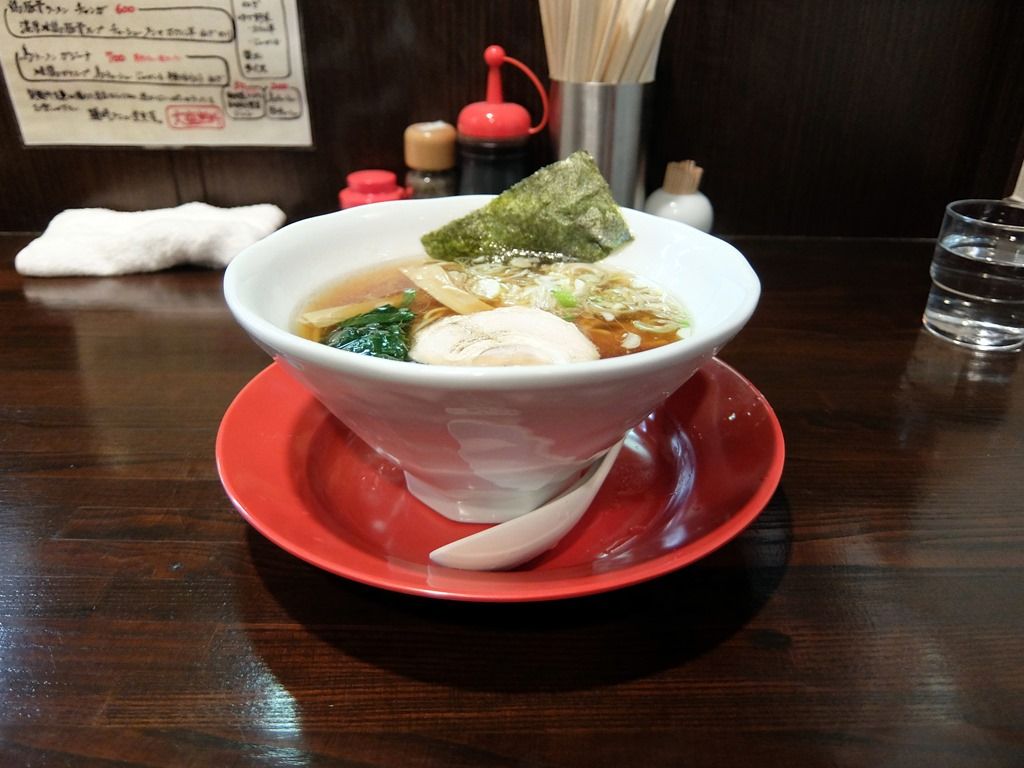 白い丼が赤い受け皿に、レンゲと共に載って登場。 具は、海苔、メンマ、チャーシュー、ほうれん草、きざみねぎ。チャーシューも大きめで他の具材もしっかりと入っていて、ワンコインとは思えない充実のビジュアル。