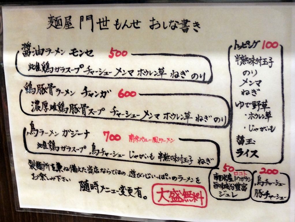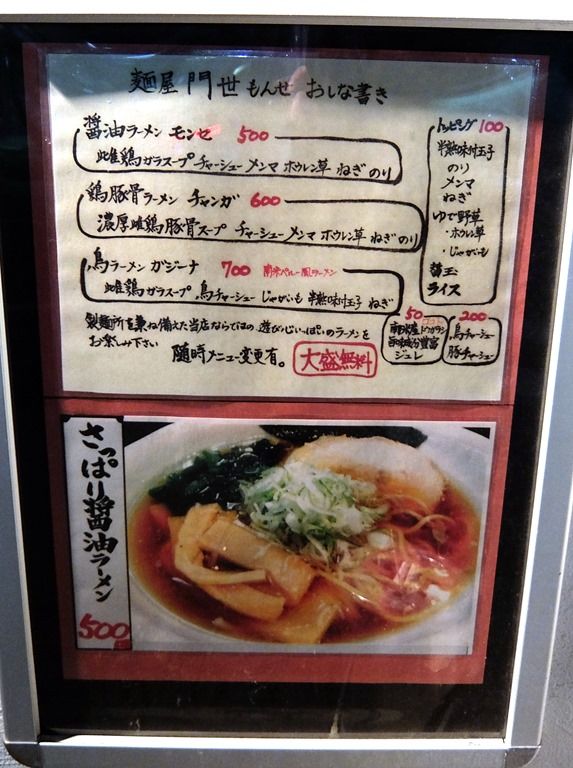 主なメニューは、 醤油ラーメン モンセ500円、