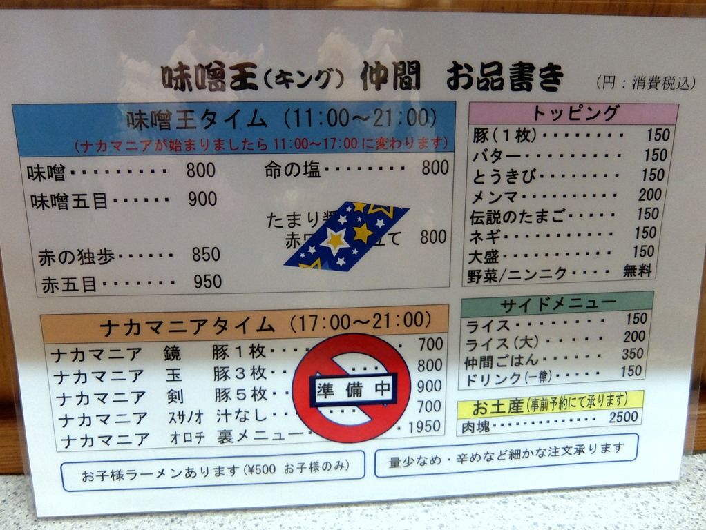 券売機は無く後会計制。 昼の部は「味噌王タイム」、夜の分は「ナカマニアタイム」という昼夜でメニューが変わる2毛作制。ですが、当面の間、昼夜共通で「味噌王タイム」。