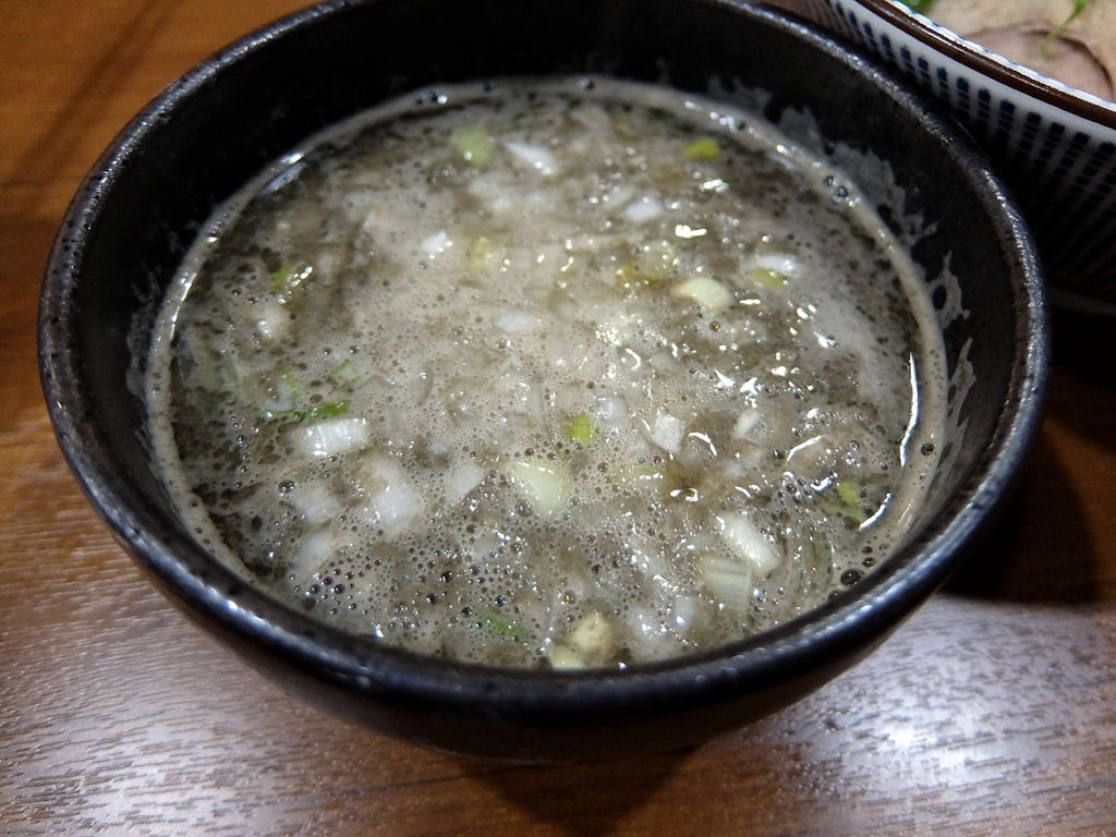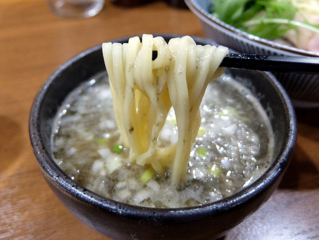 つけ汁は、粘性の無いさらさらの清湯タイプ。 煮干そば白の3~4倍の煮干しを使用とのことで、大量の煮干エキスが溶け込んでいます。