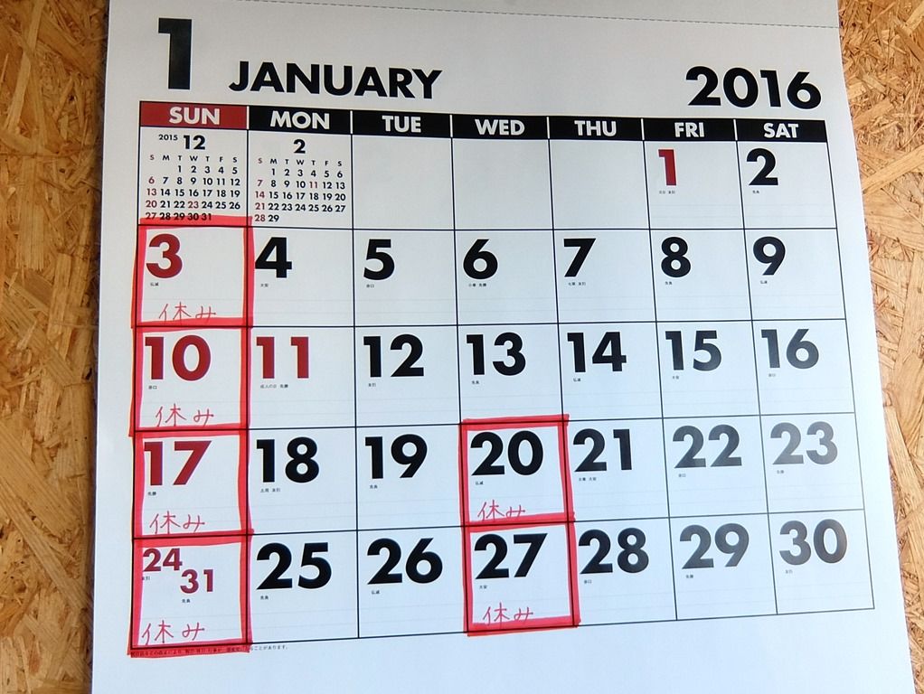 1月の営業情報。日曜定休日以外に、20日・27日が休みのため要注意。