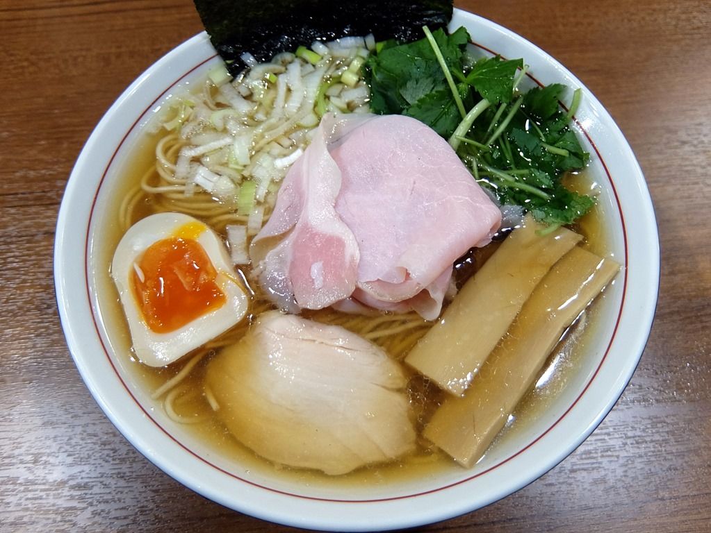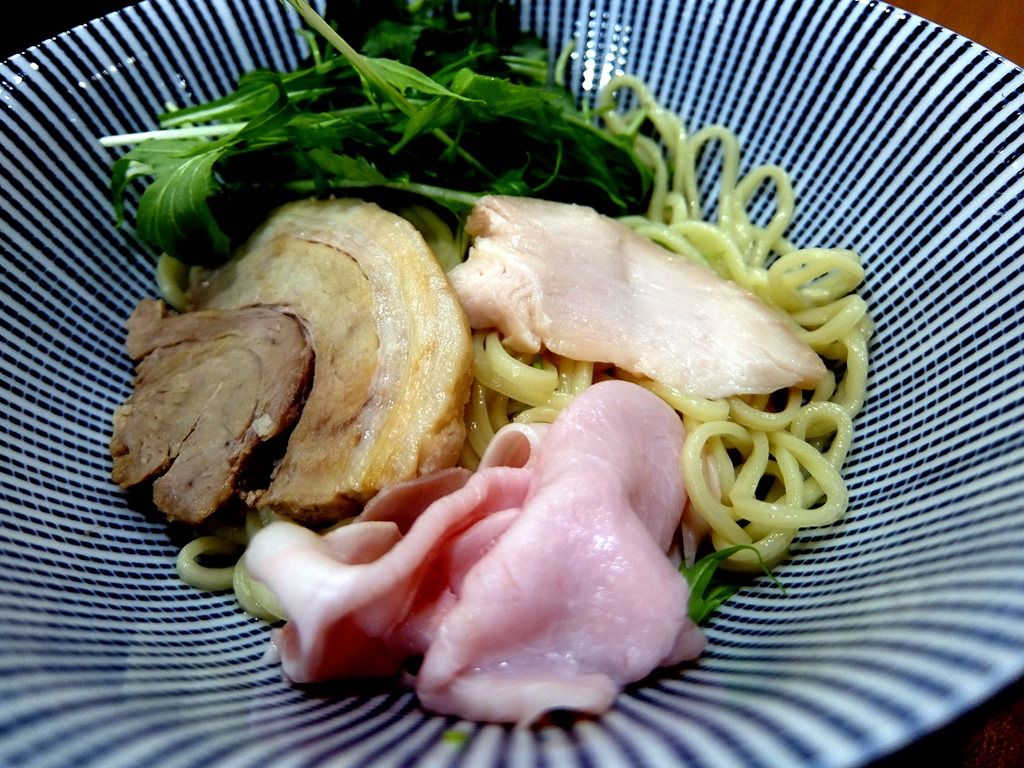 スッキリしたフォルムの、サイドが青い高台丼で登場。 具は、海苔、水菜、チャーシュー、メンマ、味玉半個、チャーシューは、低温調理の豚・鶏の2種。