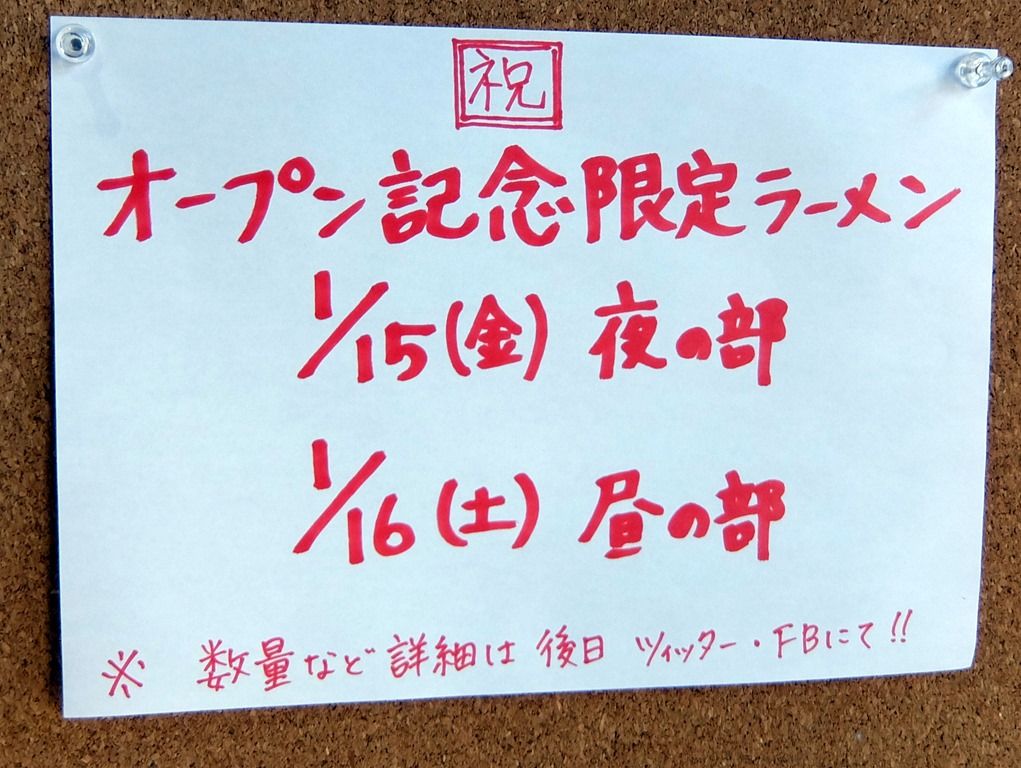 オープン記念限定ラーメンは、1/15夜の部、1/16昼の部に提供予定。