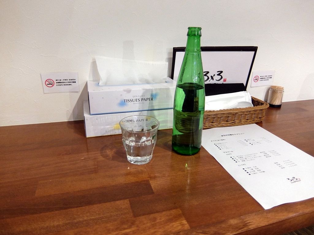 お冷は冷えた緑色の瓶とグラスが渡されます。