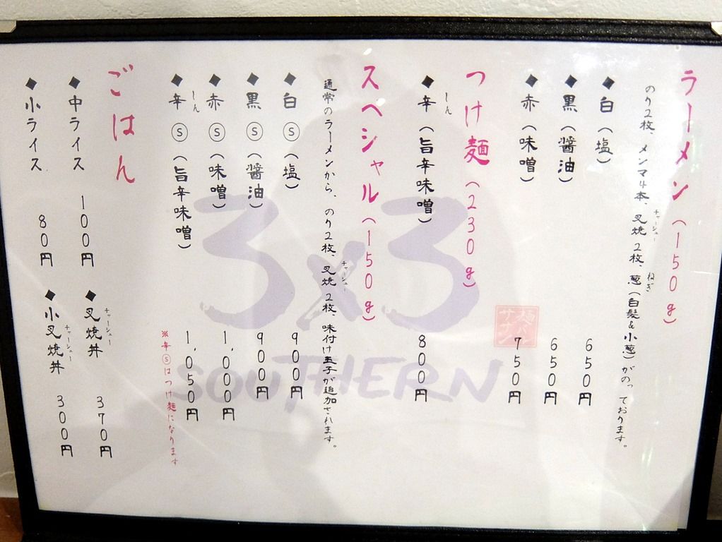 券売機は無く、後会計制。 主なメニューは、白(塩)650円、黒(醤油)650円、赤(味噌)750円、つけ麺 辛(旨辛味噌)800円、他。