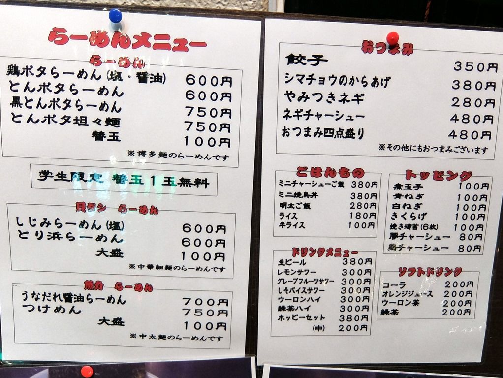 主なメニューは、鶏ポタらーめん(塩・醤油)600円、とんポタらーめん600円、とんポタらーめん750円、とんポタ担々麺750円、しじみらーめん(塩)600円、とり浜らーめん600円、他。