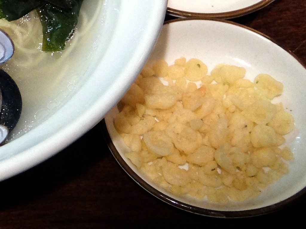 小皿で揚げ玉が提供されました。 もう1枚の小皿は、しじみの殻入れ用。