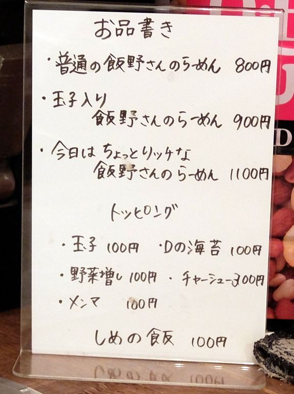 券売機は無く、先会計制。 麺メニューは、普通の飯野さんのらーめん800円、玉子入り飯野さんのらーめん900円、今日はちょっとリッチな飯野さんのらーめん1100円。