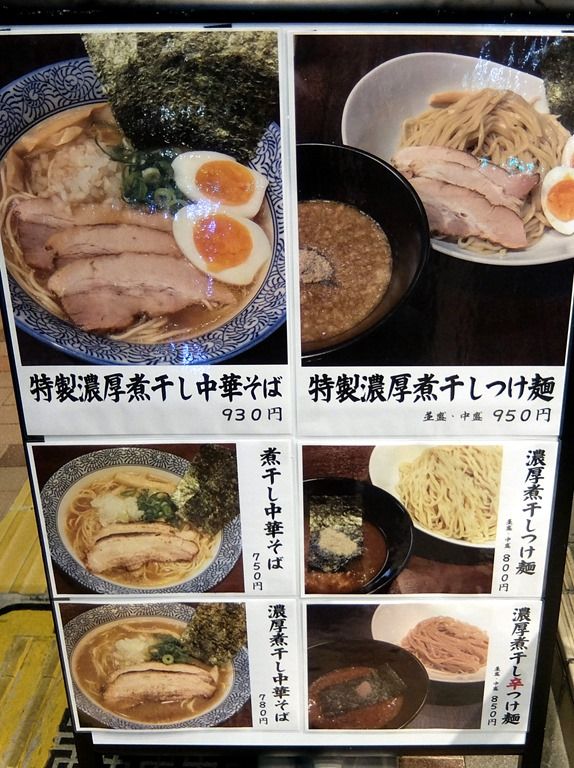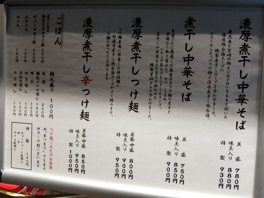 主なメニューは、濃厚煮干し中華そば780円、煮干し中華そば750円、濃厚煮干しつけ麺800円、濃厚煮干し辛つけ麺850円、他。