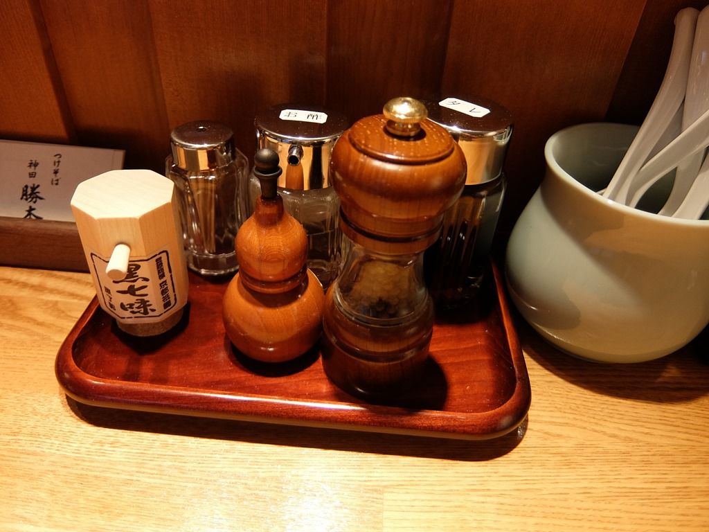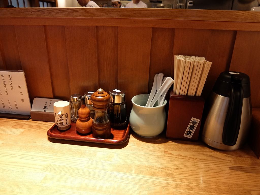 BGMは環境音楽。箸は割り箸。 卓上調味料は、黒七味、一味唐辛子、酢、たれ、ミリ入り粒胡椒。