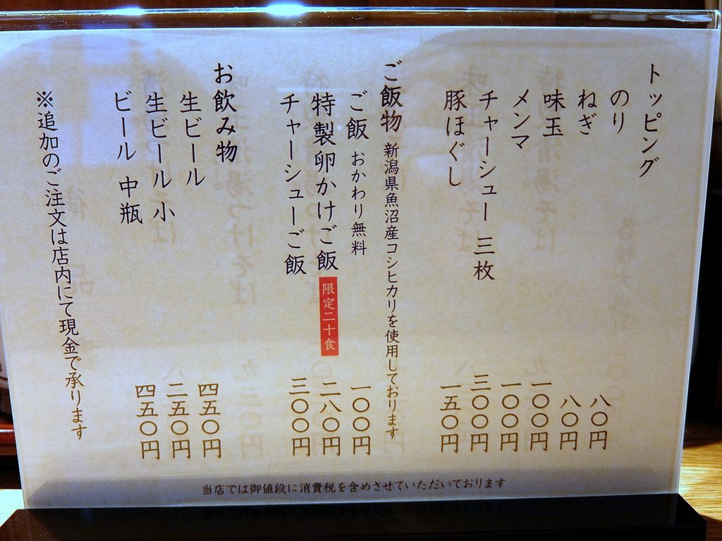 「御品書」裏は、トッピング・ご飯物・飲み物メニュー。