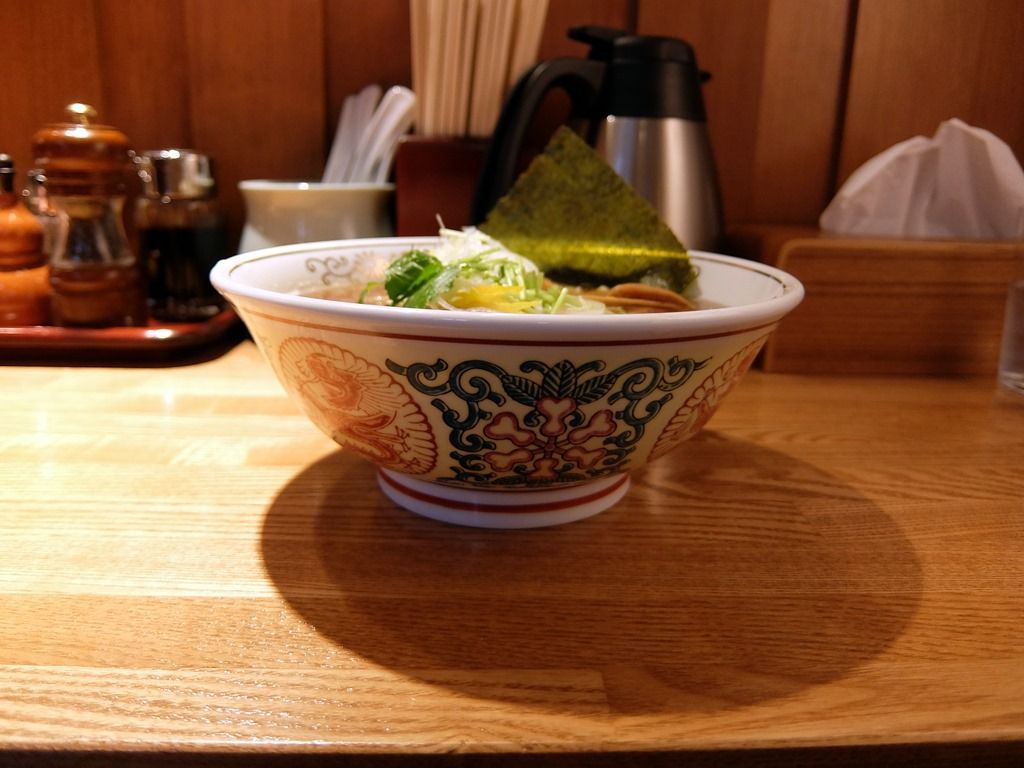 側面に赤竜が舞う本店と同じ丼で登場。 具は、海苔、気z米ネギ、三つ葉、ゆず皮、なると、チャーシュー。実物は写真以上に端正で、実に美麗なルックス!