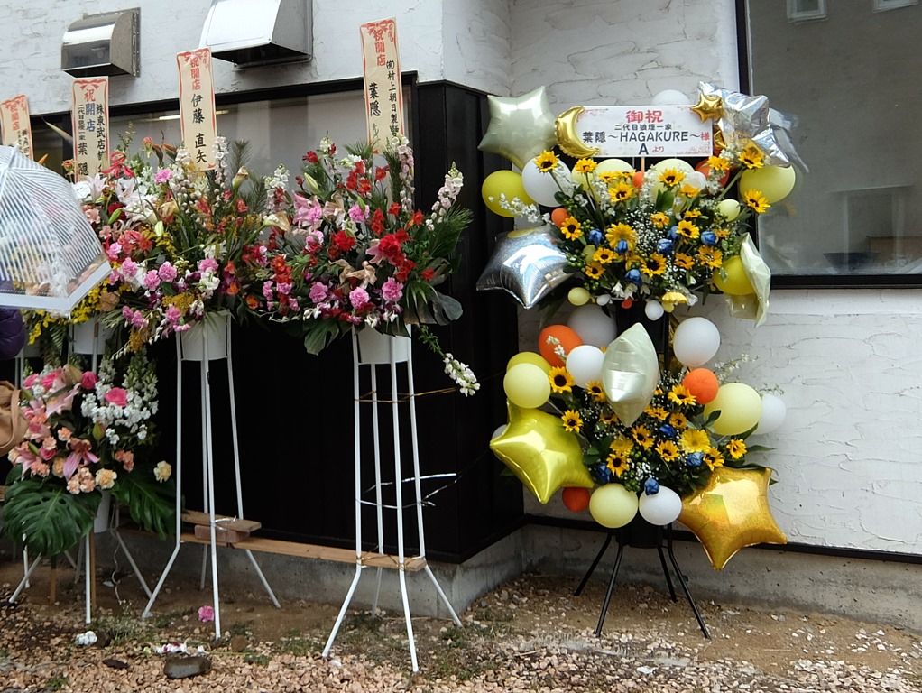 店頭には開店祝花。二代目狼煙系ではお馴染み、村上朝日製麺所からの花がありました、