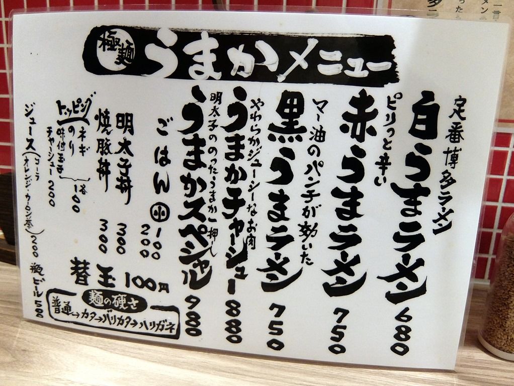 主なメニューは、白うまラーメン680円、赤うまラーメン750円、黒うまラーメン750円、替玉100円、他。