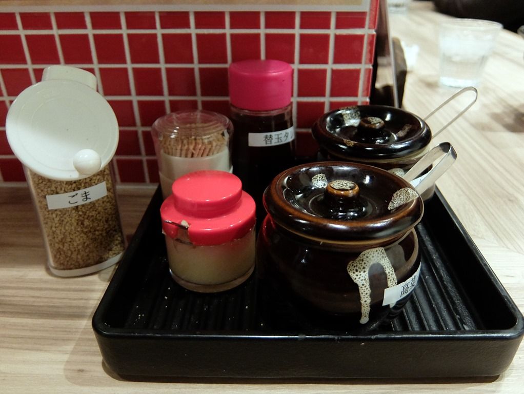 BGMはモダンジャズ。箸は洗い箸でエコ仕様。 卓上調味料は、ごま、おろしニンニク。替玉タレ、辛子高菜、紅生姜。