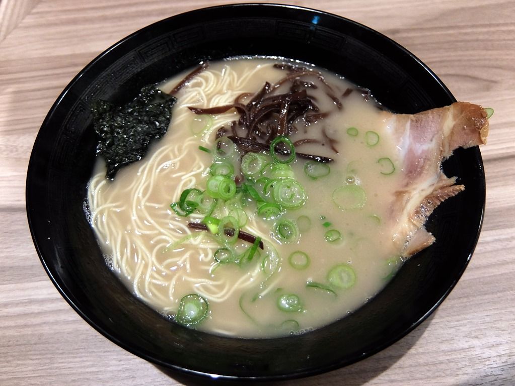 豚骨スープの白が映える黒い丼で着丼。 具は、海苔、きくらげ、チャーシュー、きざみ青ねぎ。