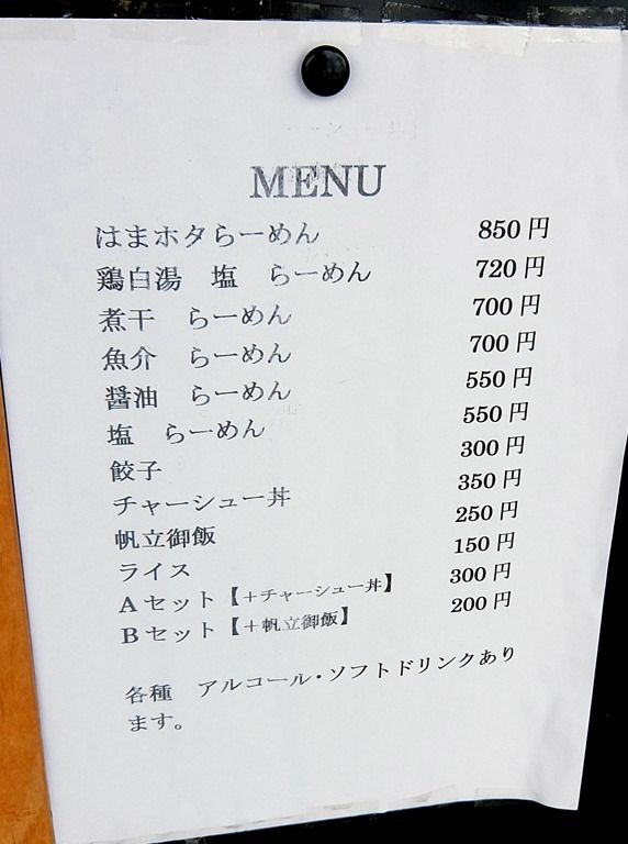 主なメニューは、はまホタらーめん850円、鶏白湯塩らーめん720円、煮干らーめん700円、魚介らーめん700円、醤油らーめん550円、塩らーめん550円、他。