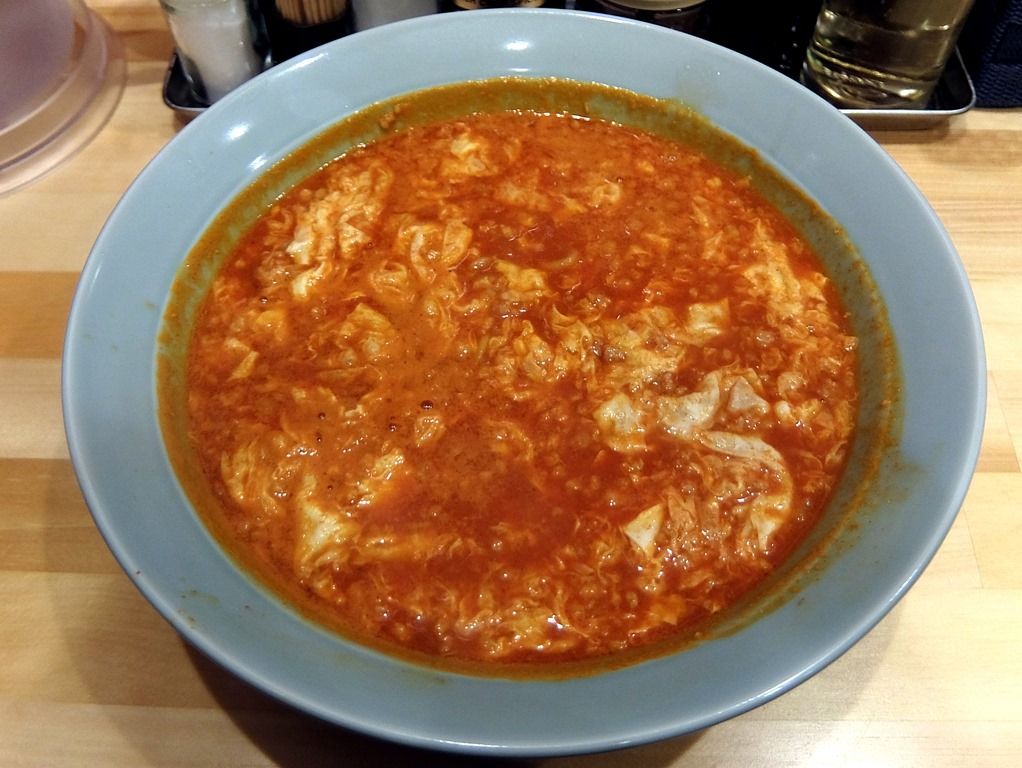 スープは、さらさらのニンニク唐辛子味噌味w たっぷりのひき肉と溶き玉子に唐辛子の刺激的な辛さが加わって、豚辛旨なジャンキーでやみつきの味にわいに!
