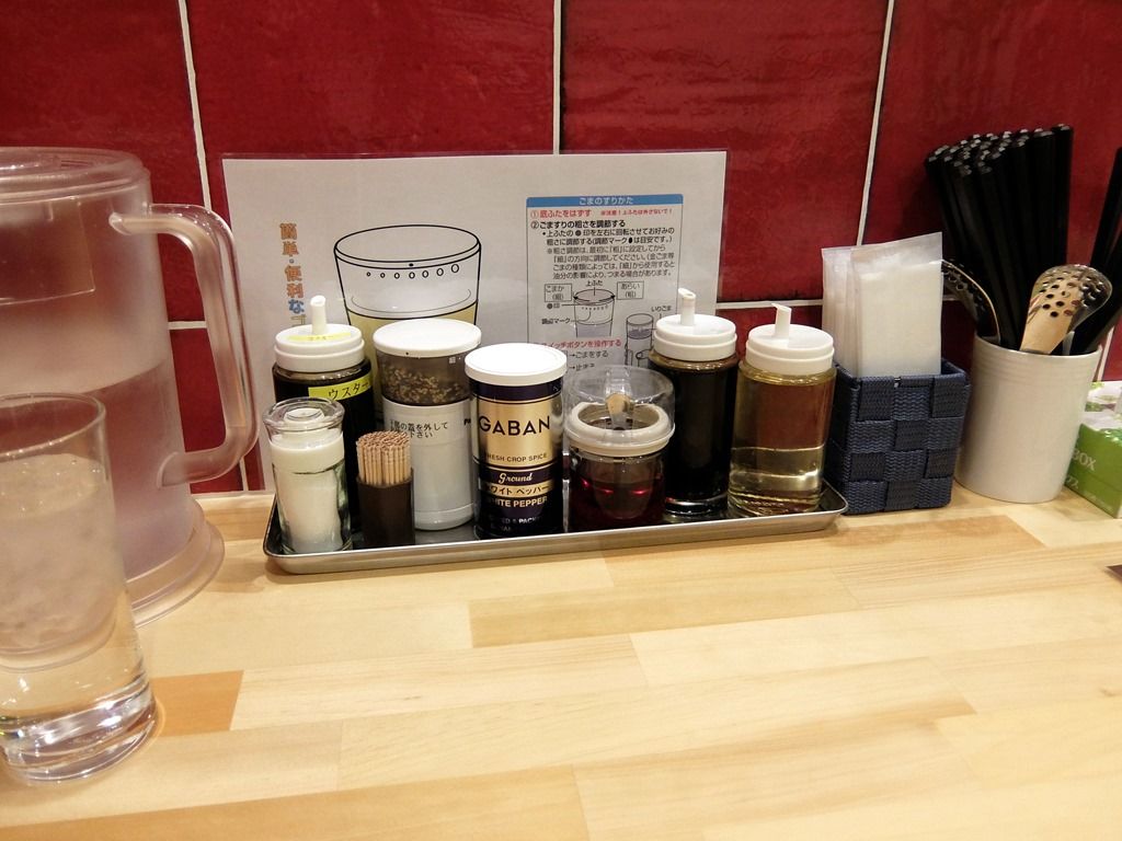 BGMはポップス。箸は洗い箸で、エコ仕様。 卓上調味料は、ウスターソース、塩、電動胡麻すり器、GABANホワイトペッパー、ラー油、醤油、酢。