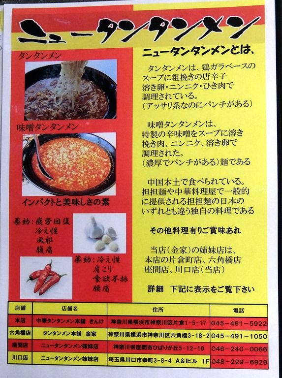 ですが、草加店がイソゲン系の「元祖ニュータンタンメン本舗」なのに対して、こちらは「中華タンタンメン本舗 きんけ」系。「きんけ」がニュータンタンメンの元祖というか本家で、「元祖ニュータンタンメン本舗イソゲン」が後発という話を聞いたことがあります。ただし、真偽というか詳細不明(^O^;)