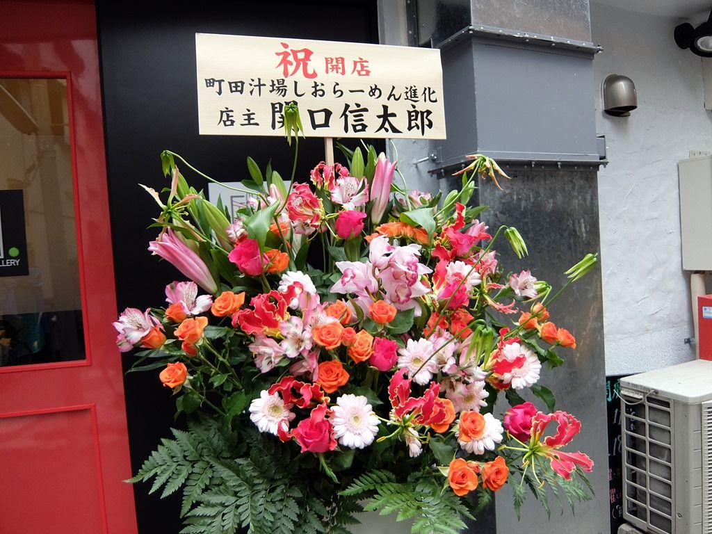 店頭開店祝花は、進化@町田の関口さんから。店内にも、進化のカップ麺がディスプレイされてました。