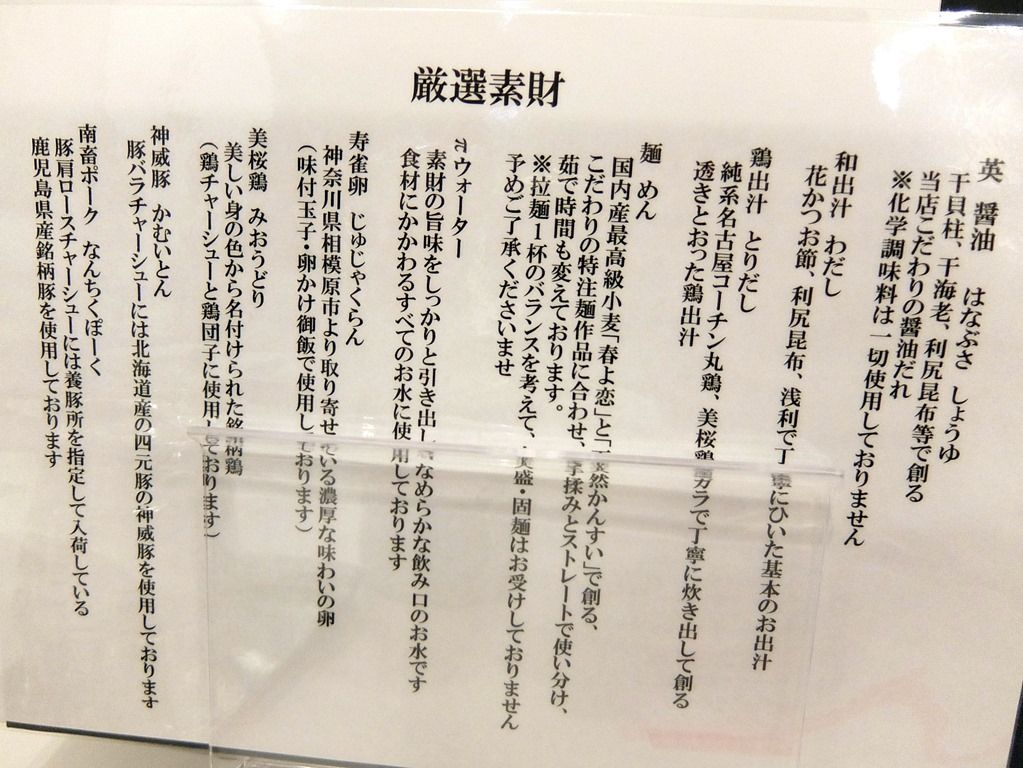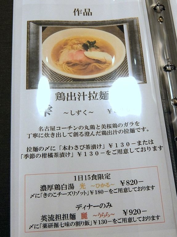 メニューの説明書きによると、「名古屋コーチンの丸鶏と美桜鶏のガラを丁寧に炊き出して創る澄んだ鶏出汁の拉麺」とか。