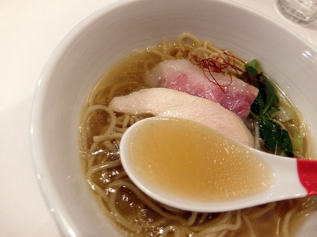 スープはさらさらの清湯醤油味。 メニューの説明書きによると、「名古屋コーチンの丸鶏と美桜鶏のガラを丁寧に炊き出して創る澄んだ鶏出汁の拉麺」とか。