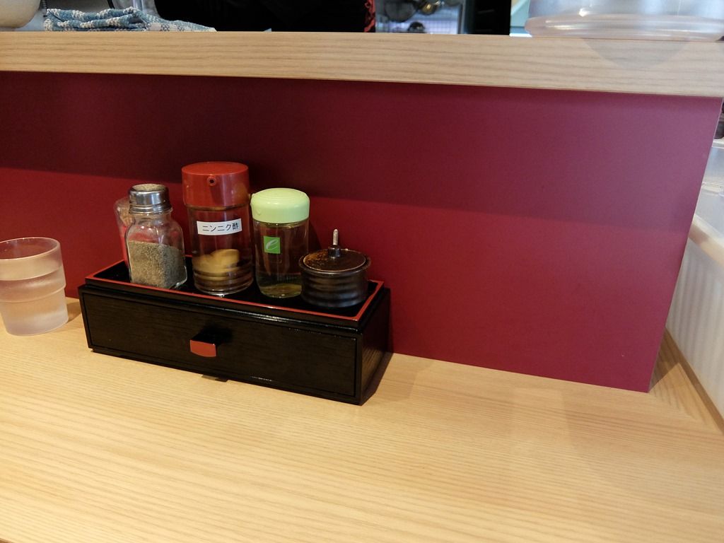 箸は洗い箸でエコ仕様。卓上調味料は、胡椒、ニンニク酢、酢、辛味調味料。
