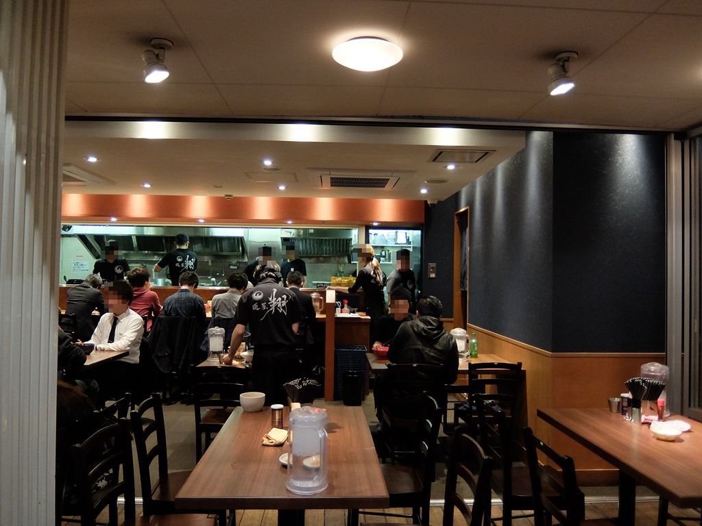 店内は、厨房前に真っ直ぐなカウンター7席、4人卓x5、2人卓x1。 後客続々途切れぬ行列。