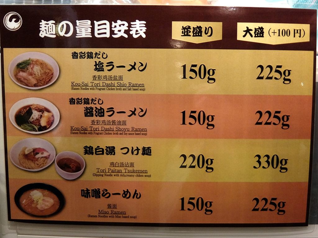 で、主なメニューは、香彩鶏だし塩ラーメン800円、香彩鶏だし醤油ラーメン800円、鶏白湯つけ麺800円、味噌ラーメン840円、辛味噌ラーメン890円、他。