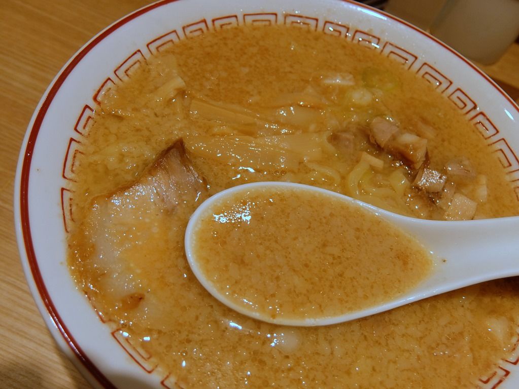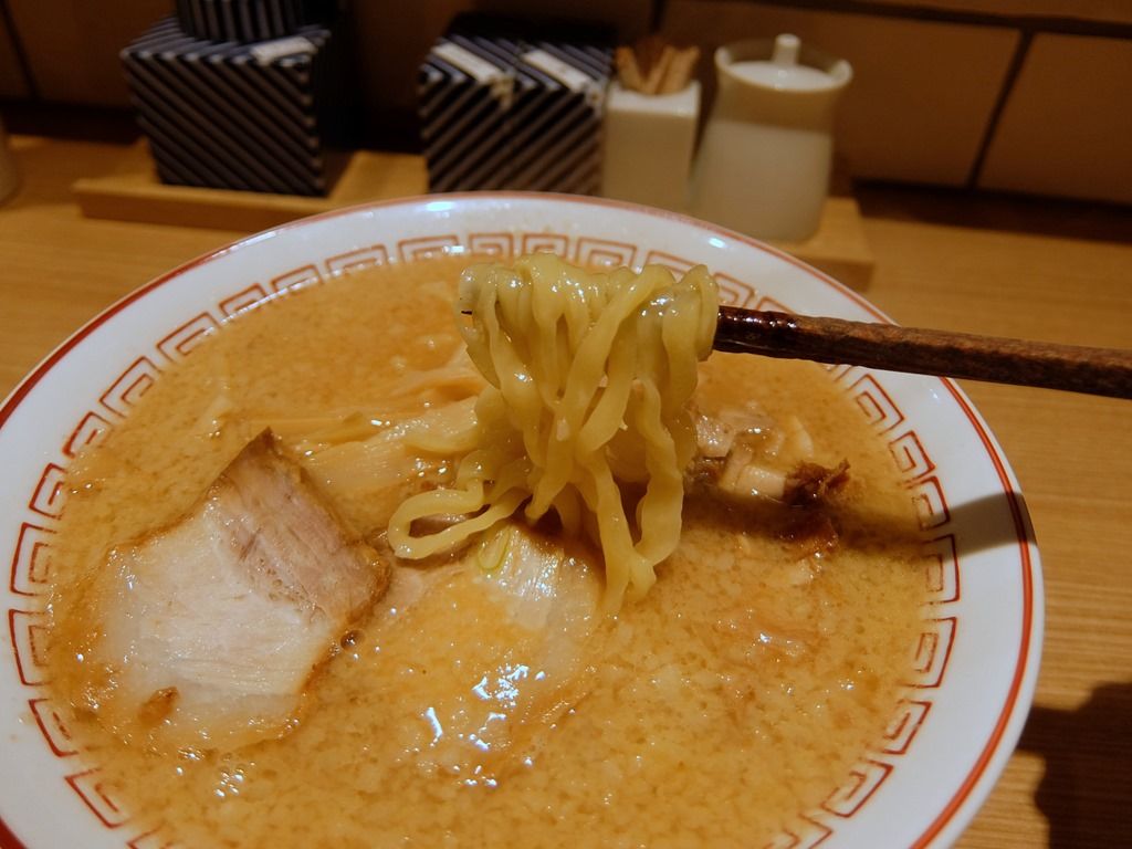 スープは、さらりとした清湯味噌味。そこにとろりとしたたっぷりの背脂が浮かんで、結果としてクリーミーなスープに変化。 すっきりとした動物性ベースのスープに背脂が加わることで、まろやかさとコクがアップ。