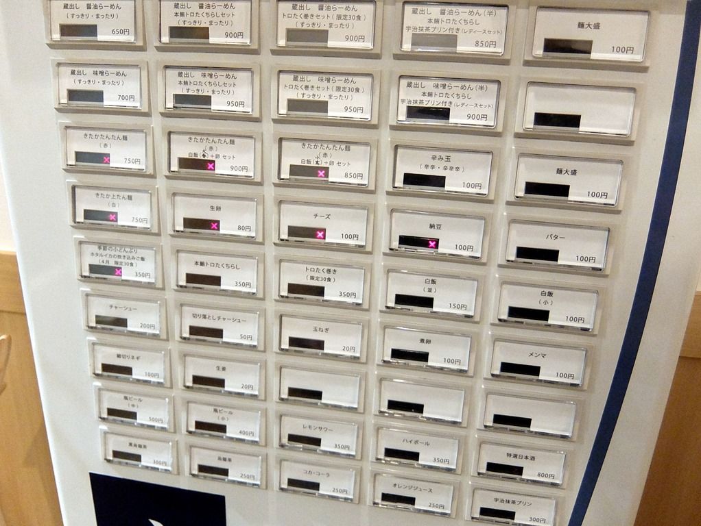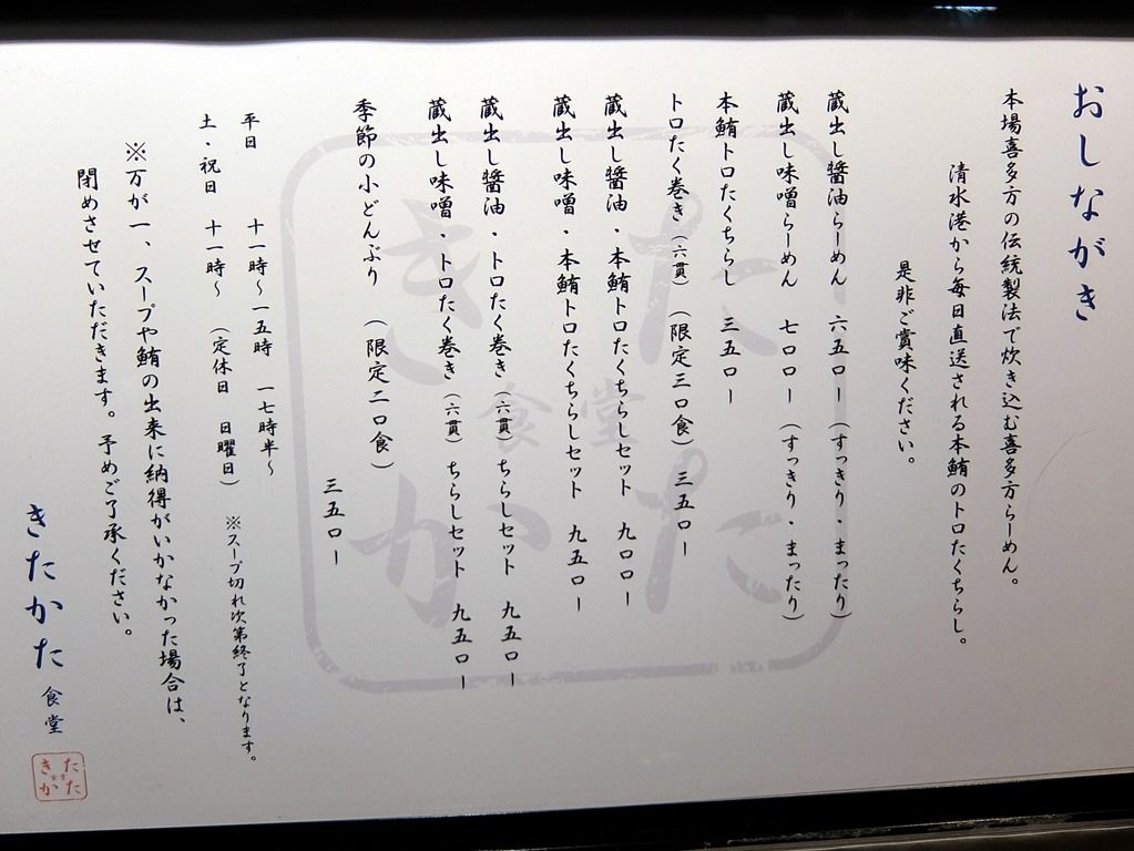 主なメニューは、蔵出し醤油らーめん650円、蔵出し味噌らーめん700円、本鮪トロたくちらしセット+300円、トロたく巻きセット(限定30食)+300円、蔵出し醤油らーめん(半)本鮪トロたくちらし宇治抹茶プリン付き(レディースセット)850円、蔵出し味噌らーめん(半)本鮪トロたくちらし宇治抹茶プリン付き(レディースセット)900円、