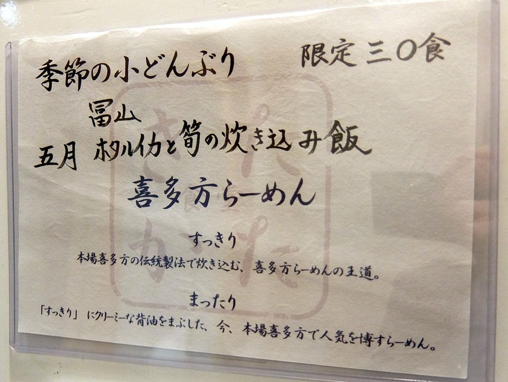 季節の小どんぶり(限定30食)300円、訪問時は「富山 五月 ホタルイカと筍の炊き込み飯」。 オーダーは、稲荷町・十条でそれぞれ「醤油・まったり」をいただいていたので、今回は「味噌」にしました。