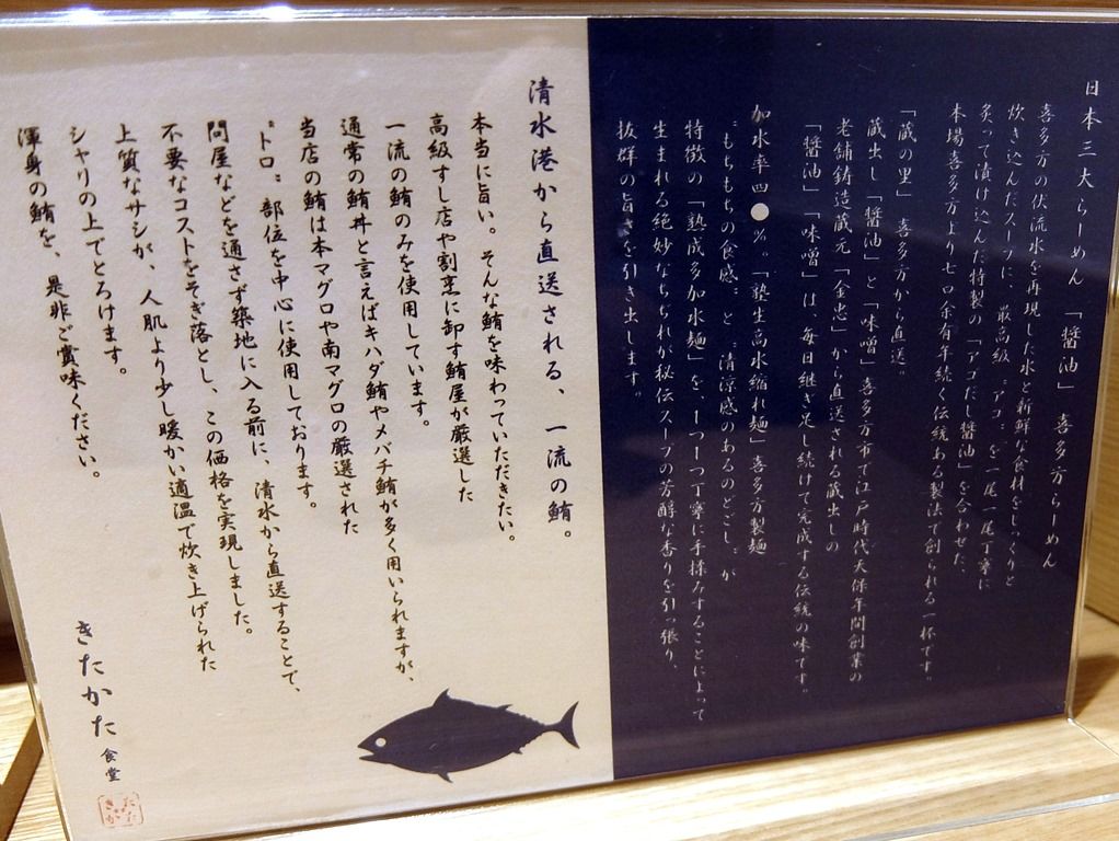 卓上メニュー立てには、喜多方ラーメンの説明とマグロの薀蓄。