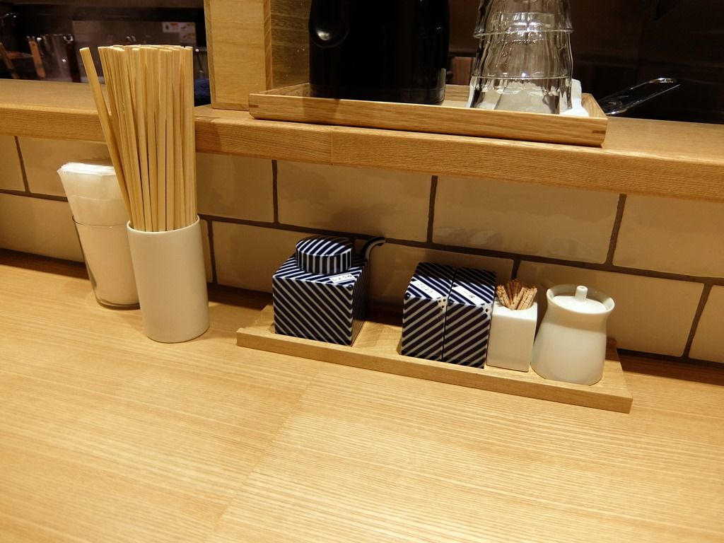 BGMはピアノのヒーリング・ミュージック。箸は割り箸。 卓上調味料は、醤油、胡椒、一味唐辛子、酢。