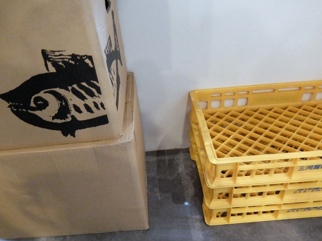 通路脇には、丸勝かつおぶし株式会社のダンボールと、三河屋製麺の麺ケース。