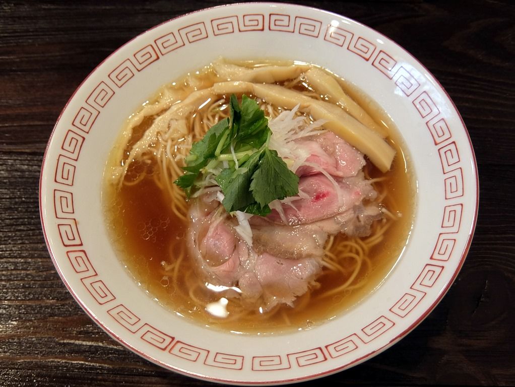 サイドの赤い八卦模様が縁を彩るトラディショナルなラーメン丼で着丼。 具は三つ葉、低温調理のピンクレアチャーシュー、穂先メンマ、白髪ネギ。