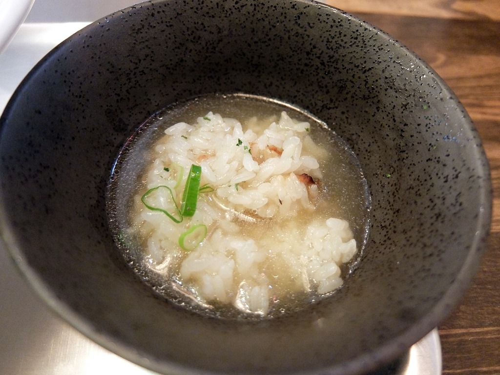 〆は少量残したご飯にイベリコ豚の塩スープをかけて、イベリコ豚の雑炊で、これがまた感涙モノの旨さでたまりません!