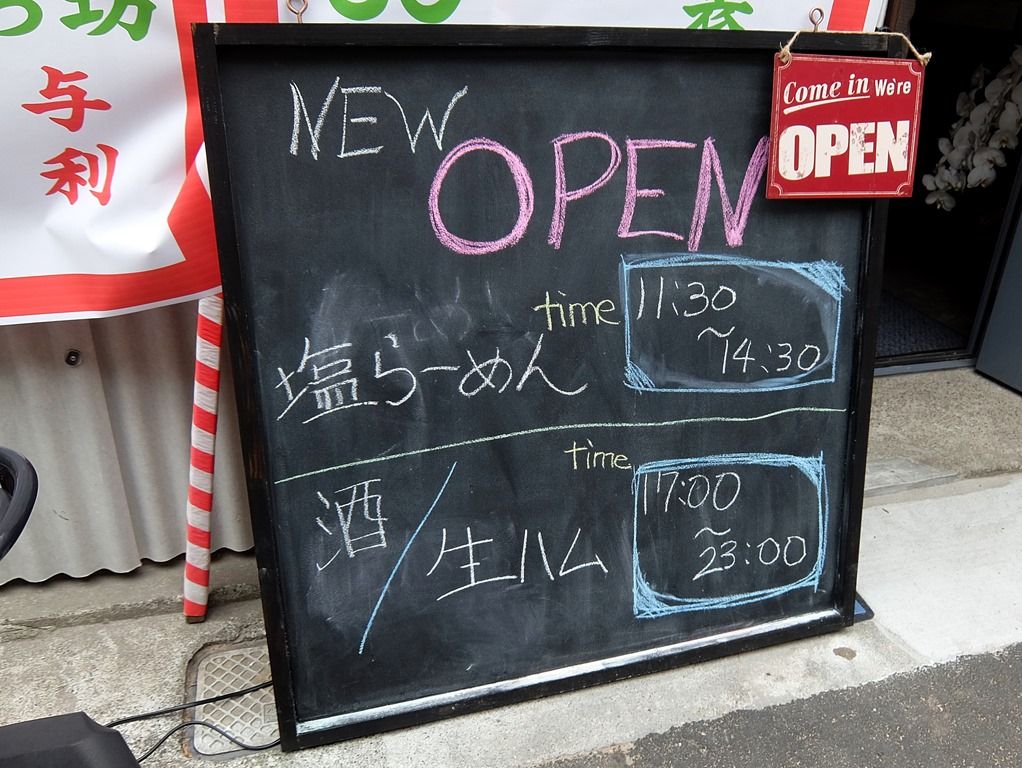 店頭の大きな花輪は、次男坊・なぶらのたまぞう出身店コンビから。ラーメン提供は基本的に昼のみ。夜は、の生ハムとおつまみを提供するBARとしての営業。