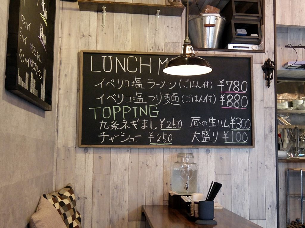 ランチタイムの主なメニューは、イベリコ塩らーめん(ご飯付)780円、イベリコ塩つけ麺(ご飯付)880円、他。