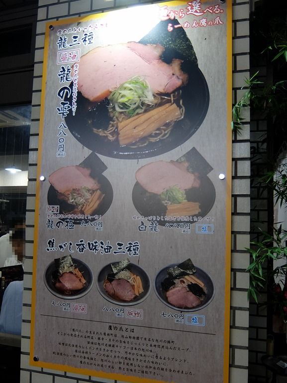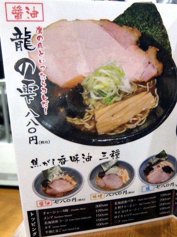 主なメニューは、龍の雫(醤油)880円、龍の極(味噌)980円、白竜(塩)880円、焦がし香味油 醤油780円、味噌880円、塩780円、他。
