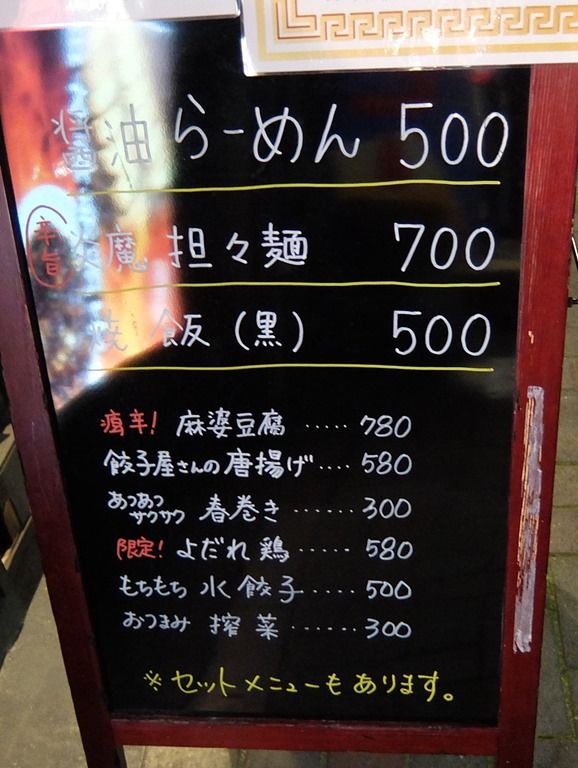 主なメニューは、芳醇醤油ラーメン500円、炎魔担々麺700円、他。この日はセールで、醤油ラーメンが300円。ですが、気分は担々麺だったので、セールを無視w