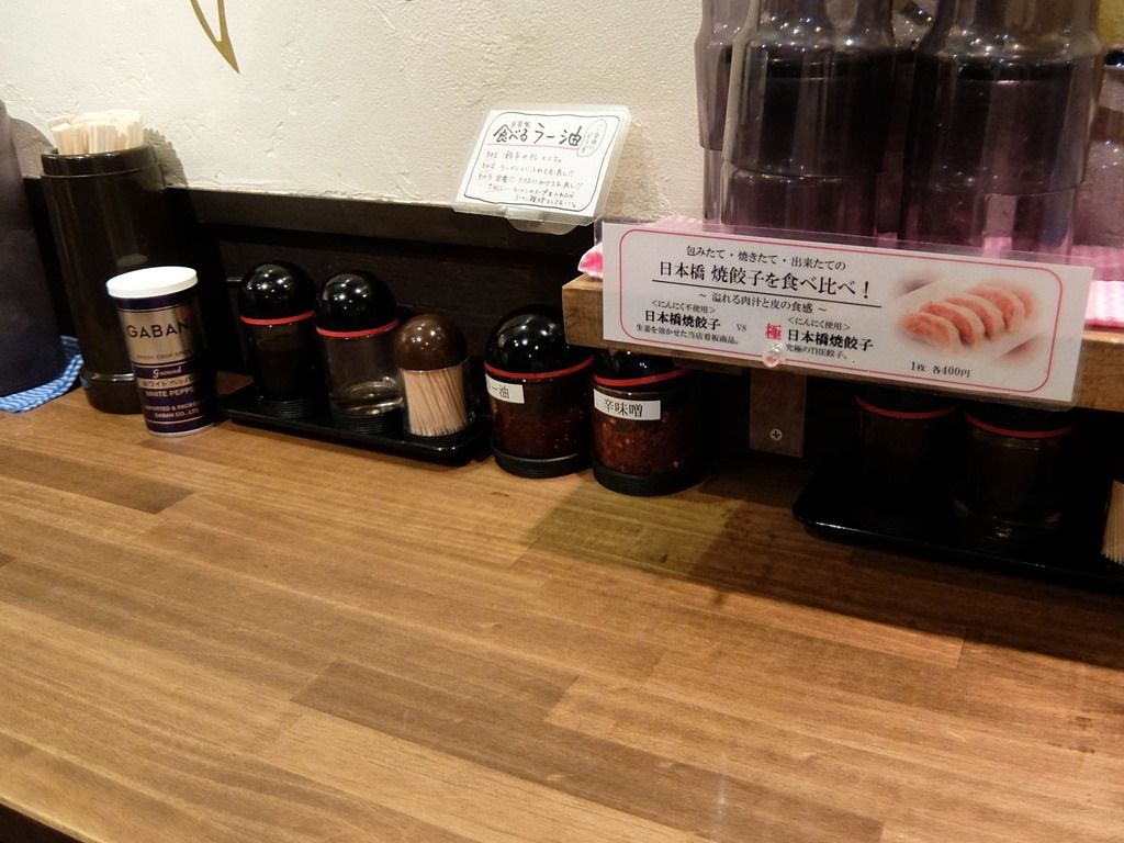 卓上調味料は、GABANホワイトペッパー、醤油、酢、食べるラー油、辛味噌。
