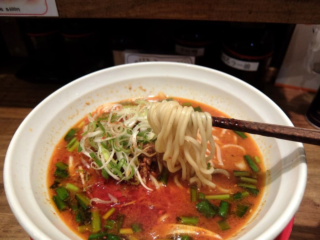 スープは、さらさらの担々胡麻味。ベースは鶏清湯かと。そのまま飲むと、胡麻の風味はそこそこですが、ちょっと薄いかも。ただ、肉味噌を溶かすと、いい感じにコクが出てきます。まあ普通に美味しいかと。