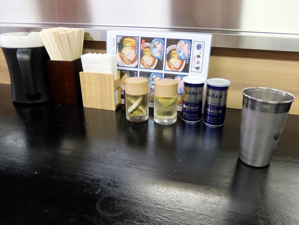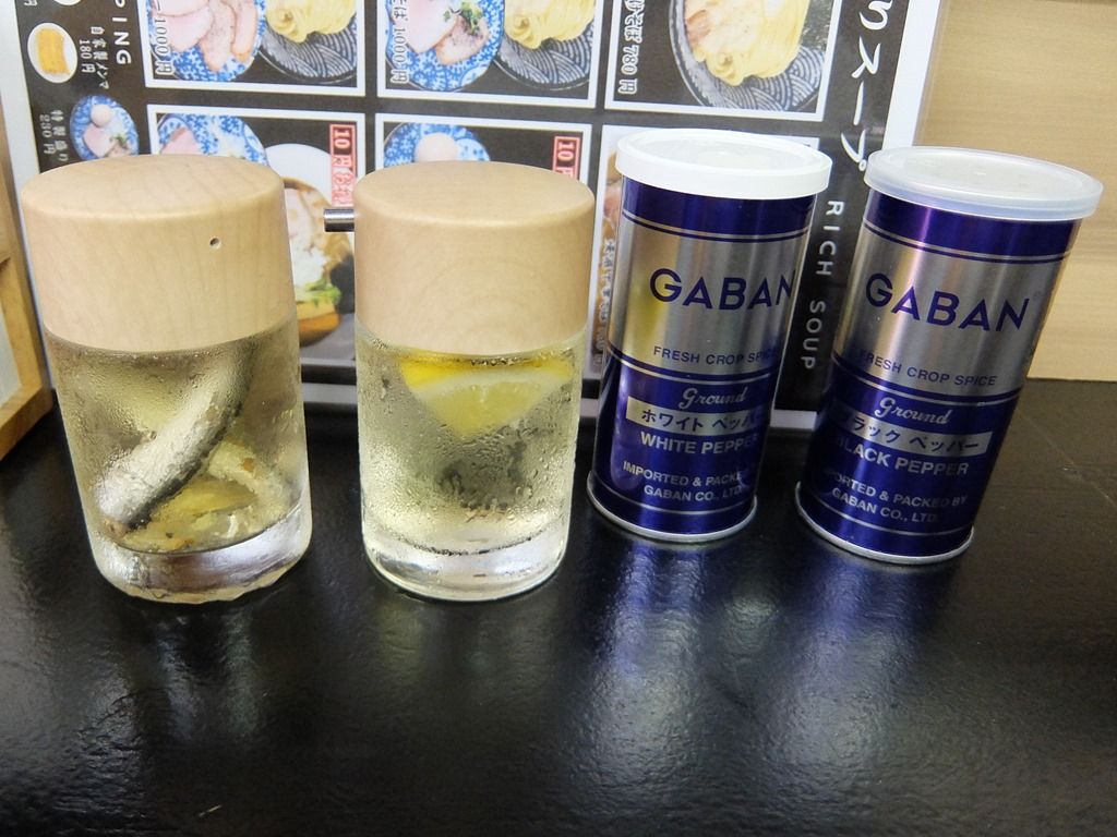 BGMは無し。箸は割り箸。卓上調味料は、煮干酢、レモン酢、GABANホワイトペッパー・ブラックペッパー。