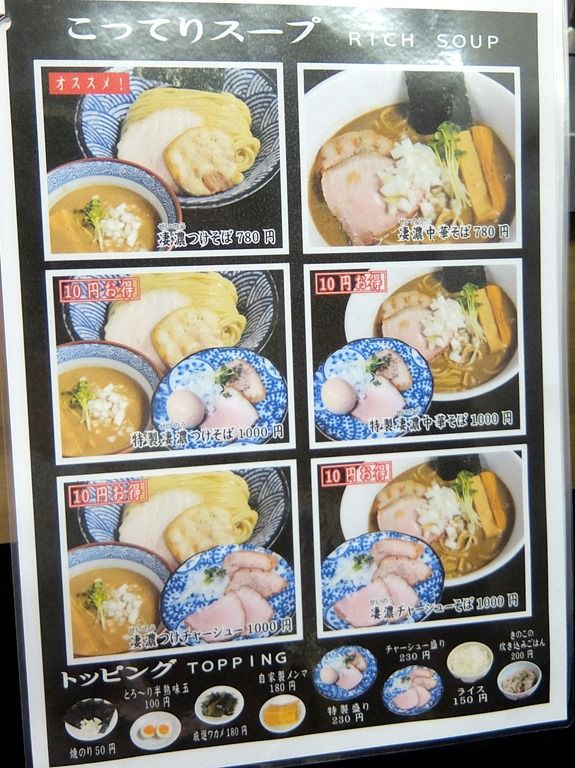 主なメニューは、あっさりスープの豊香中華そば(並)750円、豊香つけそば(並)750円、こってりスープの凄濃中華そば(並)780円、凄濃つけそば(並)780円、きのこの炊き込みご飯200円、他。