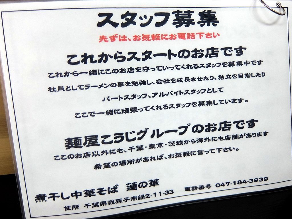 2016年7月1日オープン。柏市の「大勝軒てつ」のスタッフの方が独立開業。店名は、我孫子市・柏市などに広がる手賀沼の蓮の群生地にちなんだものとか!?久々にこうじグループの新店へw